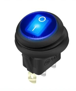 Interrupteurs à bascule ronds IP 65, éclairés (LED bleue/rouge/verte), 20 A à 12 V DC, montage rapide 20 mm, boîtier nylon 66 robuste.