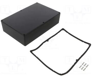 Boîtier en aluminium, IP66 étanche, dimensions 222 × 146 × 55 mm, finition noire.