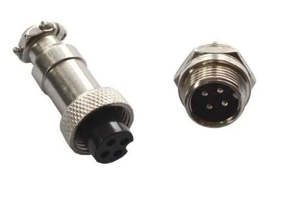 Connecteur circulaire GX12 à 4 broche, prises femelles et embase, broches mâles à souder, boîtier métallique robuste.