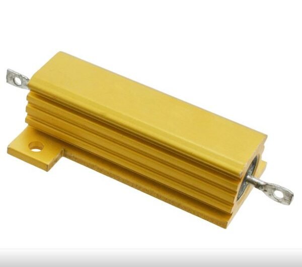 Résistance de puissance 13,6 Ω / 50 W en boîtier aluminium, montage châssis via pattes de fixation, tolérance ±5 %, coefficient thermique ±50 ppm/°C.